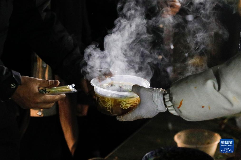 12月19日晚,在积石山县大河家镇大河村安置点,受灾群众领取爱心牛肉面。