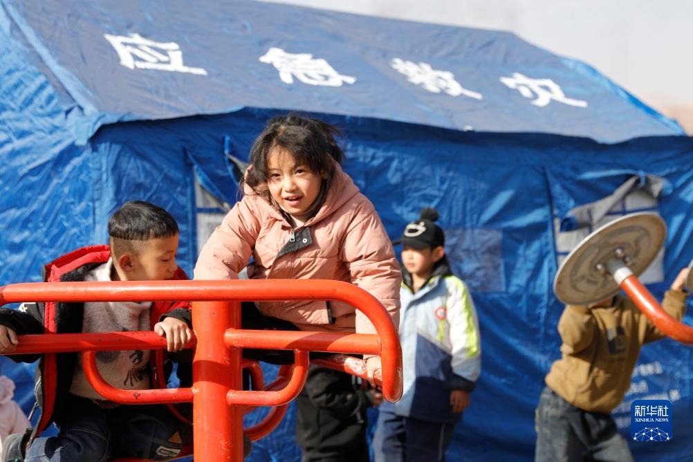 12月20日,在积石山县大河家镇大河村安置点,小朋友在帐篷外做游戏。