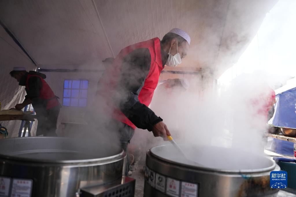 12月20日,在积石山县大河家镇大河村安置点,爱心企业的工作人员为受灾群众制作免费牛肉面。