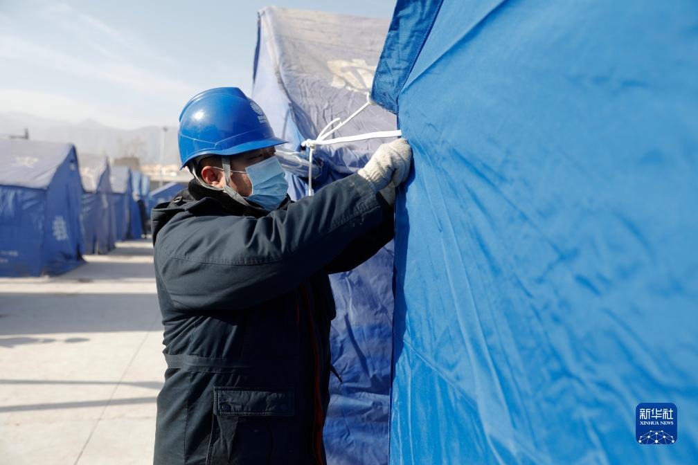 12月20日,在积石山县大河家镇大河村安置点,国家电网工作人员在为新搭建的帐篷通电。