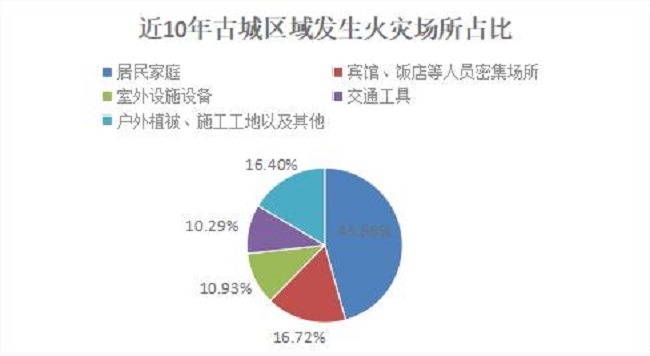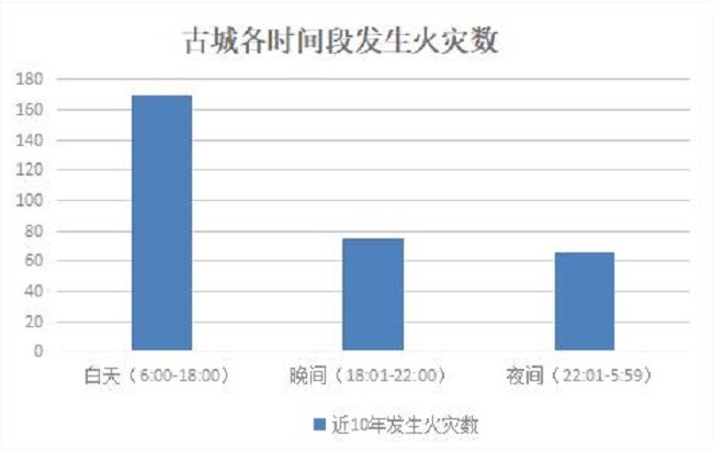 近10年来,古城区域共发生非轻微类火灾事故311起,死亡6人,未发生较大以上火灾事故;消防救援队伍共接警出动1810起,出动车辆3030辆,出动警力15480人,抢救被困人员30人,疏散被困人员24人。综合分析有以下几个方面的特点。