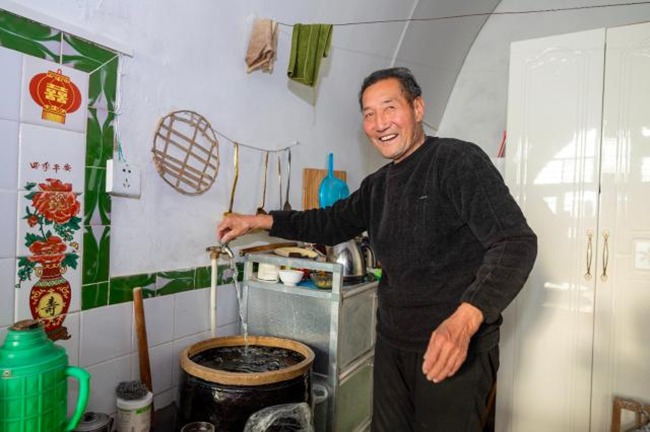 “小时候靠人挑水,后来家家修蓄水池存雨水。可雨水熬粥,上面总漂着一层白乎乎的东西,没一点米香,必须得抓把碱放进去,才能咽得下去。现在这水,是从地下550米抽上来的,又经机器净化,水清亮亮的,没一点怪味,自来水管直接通到灶台上,这样的好日子,以前想都不敢想啊!”