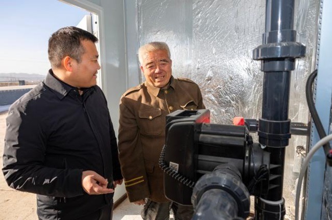 村民尚小青(右)巡视新投运的水泵机组