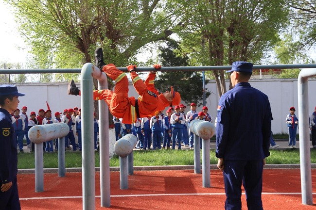 训练场上,一场精彩的技能演示将活动推向高潮。消防员身着橙色救援服,为师生们展示了复杂地形障碍穿越训练科目。只见消防员身姿矫健、动作迅猛,在梅花桩等障碍间灵活穿梭,熟练完成各项动作,干净利落的演示赢得了师生们的阵阵喝彩。通过直观的技能展示,孩子们不仅领略了消防员的过硬本领,更深刻体会到消防救援工作的艰辛与不易,进一步激发了对消防职业的崇敬之情。