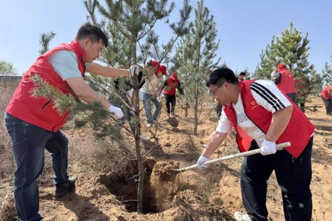 经过一天的辛勤劳作,新栽种的15000余株樟子松迎风挺立、错落成行,深深扎根于矿区沃土,在春日暖阳中舒展枝叶。