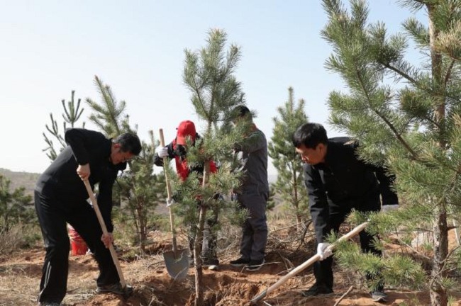 神东员工和大柳塔镇党政机关及驻镇单位、神木市实验中学等约1500人参加此次义务植树活动,企地人员携手挥锹播绿,为矿区添新颜。