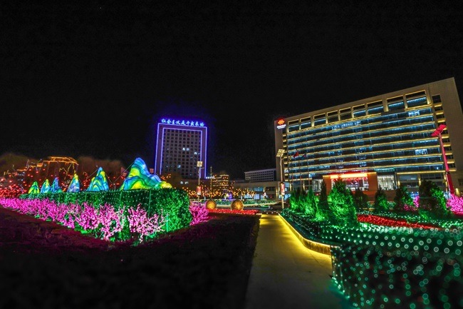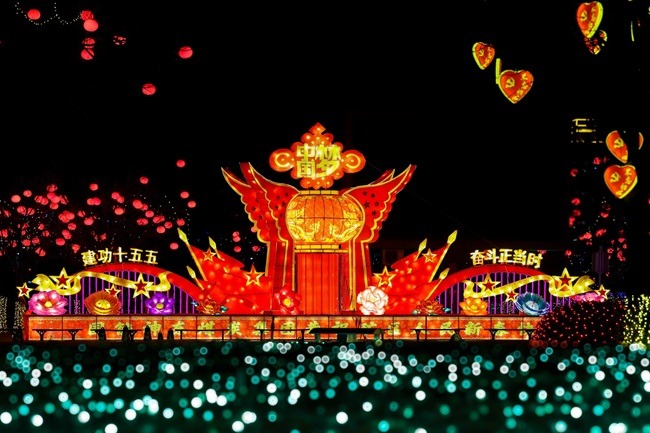 公司精心设计制作的“建功十五五、奋斗正当时”大型彩灯在夜晚显得格外醒目,