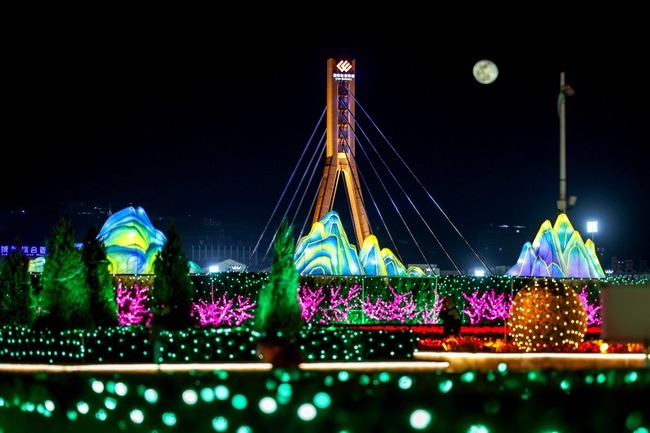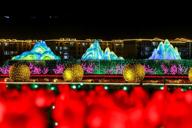 花灯间绚丽的五彩山峰与楼宇灯火交相辉映,寓意公司在发展中不断探索前进的壮丽高度。