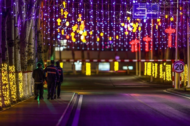 矿井附近温暖的灯带,照亮矿工下班回家的路。