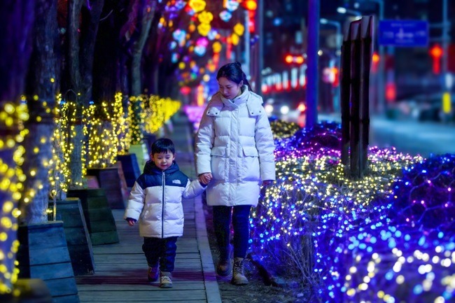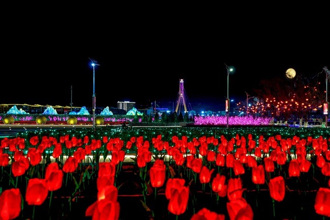 大型彩灯吸引了矿区广大职工家属前来打卡拍照,与孩子一起记录、分享这迷人绚丽的夜景。