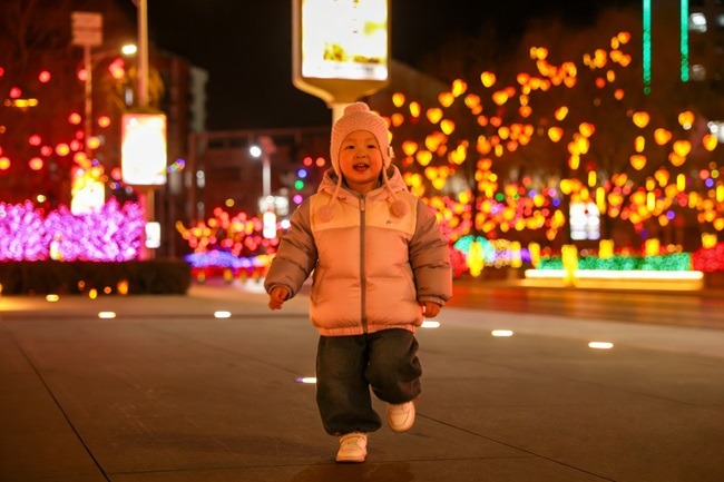 花灯吸引着矿区小朋友前来观看、玩耍,一个小孩高兴地在花灯前跑了起来。