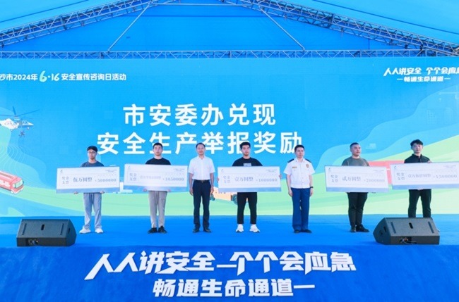 活动当天,长沙市安委办公开表彰了安全生产举报有功人员,并现场发放了最高5万元的现金奖励。长沙市强力推进《长沙市安全生产领域有奖举报实施办法》,积极倡导和激励广大人民群众争当安全生产“吹哨人”,参与社会安全监管,排查和报告身边的安全风险隐患和安全生产违法违规行为,着力开创“安全齐抓共管、社会同频共振”的安全监管工作格局。2023年,长沙市共受理安全生产举报件13806起,发放奖金337万元。今年以来,单笔奖励金额最高达到5万元,累计消除各类举报风险隐患1.1万余处。