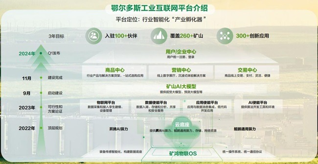 平台是以“矿鸿”操作系统、人工智能技术为核心,包含 AI 算力、工业大模型、AI 算法模型以及应用开发环境、物联网等全套先进技术为一体的综合性行业“产学研用”一体化平台。目前,已有中国 18 家 AI 伙伴、16 家“矿鸿”伙伴、10家矿山企业与鄂尔多斯签约入驻平台。以数字技术赋能产业转型升级,实现煤矿生产智能化全覆盖,成为连接矿山生产、生态伙伴企业的智慧桥梁。