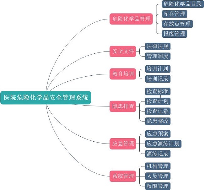 医院危险化学品安全管理系统主要包括危险化学品管理、安全文件、教育培训、隐患排查管理业务、应急管理、系统管理。
