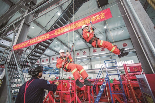 在服务发展方面,开展“服务高质量发展十项行动——应急救援技能培训进央企”特色党建活动,结合不同队伍能力特点,以社会应急力量专项技术优势服务企业安全发展。2024年3月,组织天津蓝天救援队为国家海上油气应急救援天津队开展高空绳索基础技术培训;2024年6月,为中建三局华北公司工程抢险救援队定制工程抢险伤员转运培训课程,将专业技能送到企业一线。