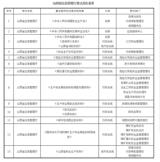 8.各相关处室和单位要按照我厅2020年“谁执法谁普法”普法责任清单(附件2)和我厅2020年法治惠民实事项目(附件3)要求,借助行政审批、执法检查、安全培训和调研座谈等时机,向行政相对人大力宣传应急管理、安全生产方针政策和《安全生产法》《消防法》《突发事件应对法》《生产安全事故应急条例》《山西省消防条例》《山西省安全生产条例》等安全生产法律法规。通过开展安全生产集中检查和专项检查,集中排查全省安全生产隐患,严厉打击安全生产领域非法违法行为,保障人民群众生命财产安全。在森林防火重点时段播放森林防火公益宣传片,在“安全生产月”“12.4”宪法日等活动期间开展安全生产宣传教育“五进”活动,提高群众安全生产法律意识。继续参加省司法厅“谁执法谁普法”履职报告评议活动,检验普法责任制落实情况。